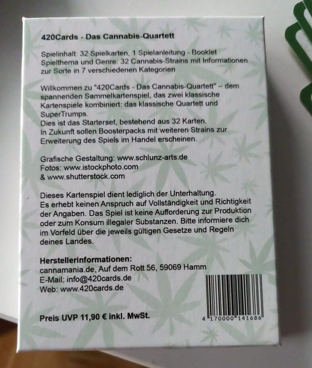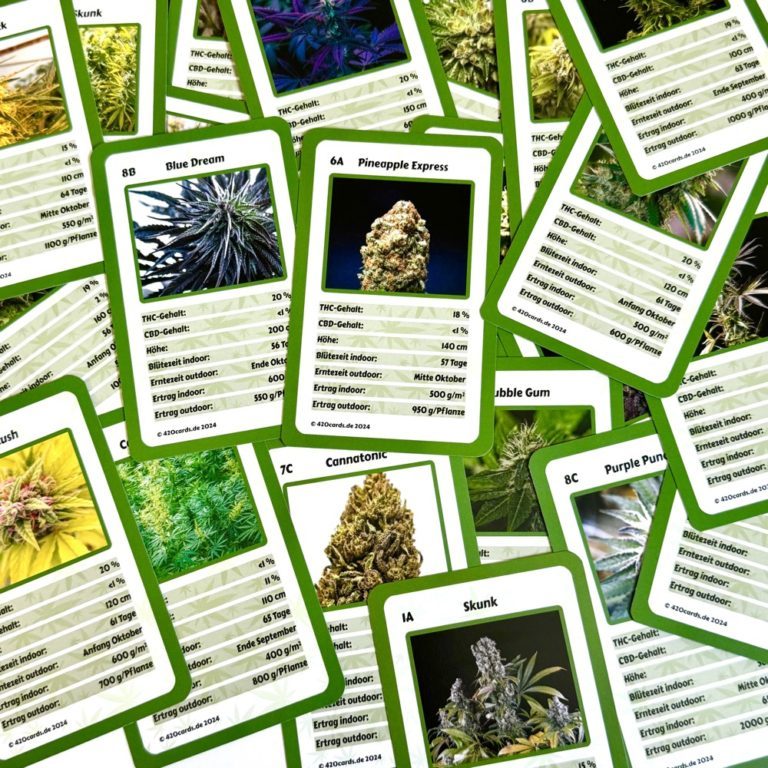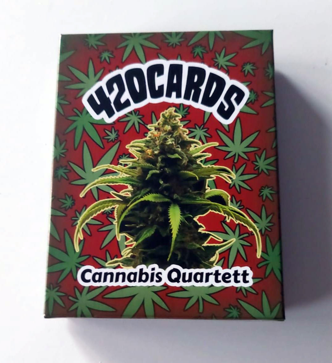 Die 420Cards sind ein klassisches Quartett-Spiel, nur eben mit Cannabissorten. Die Regeln dürfte wohl so ziemlich jeder kennen, der irgendwie in den 80ern oder 90ern aufgewachsen ist. “4 Zylinder – Sticht” dürfte wohl so ziemlich jeder dutzende Male im Leben gesagt haben. Jetzt könnt ihr das auch mit Euren Lieblings-Strains spielen! Das vollständig in Deutschland produzierte Spiel darf auf keiner Sesh mehr fehlen!