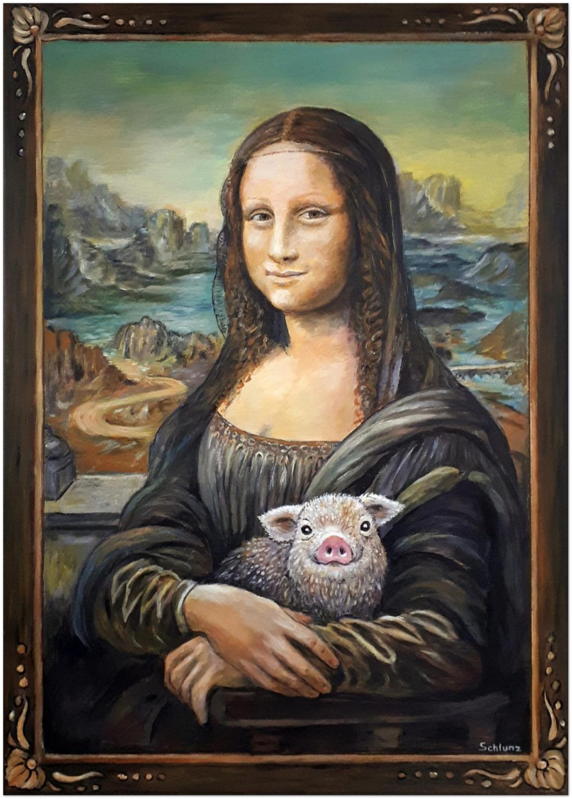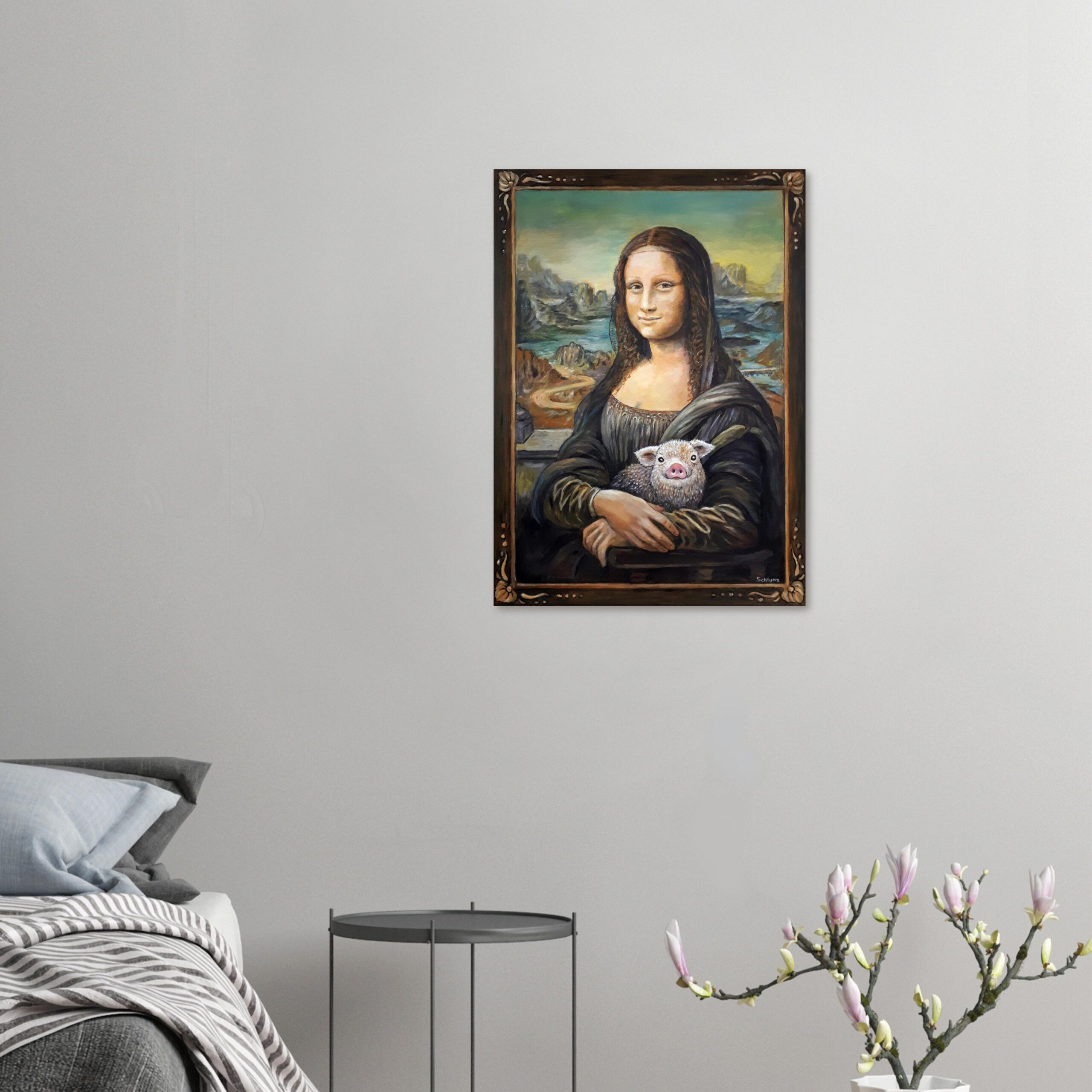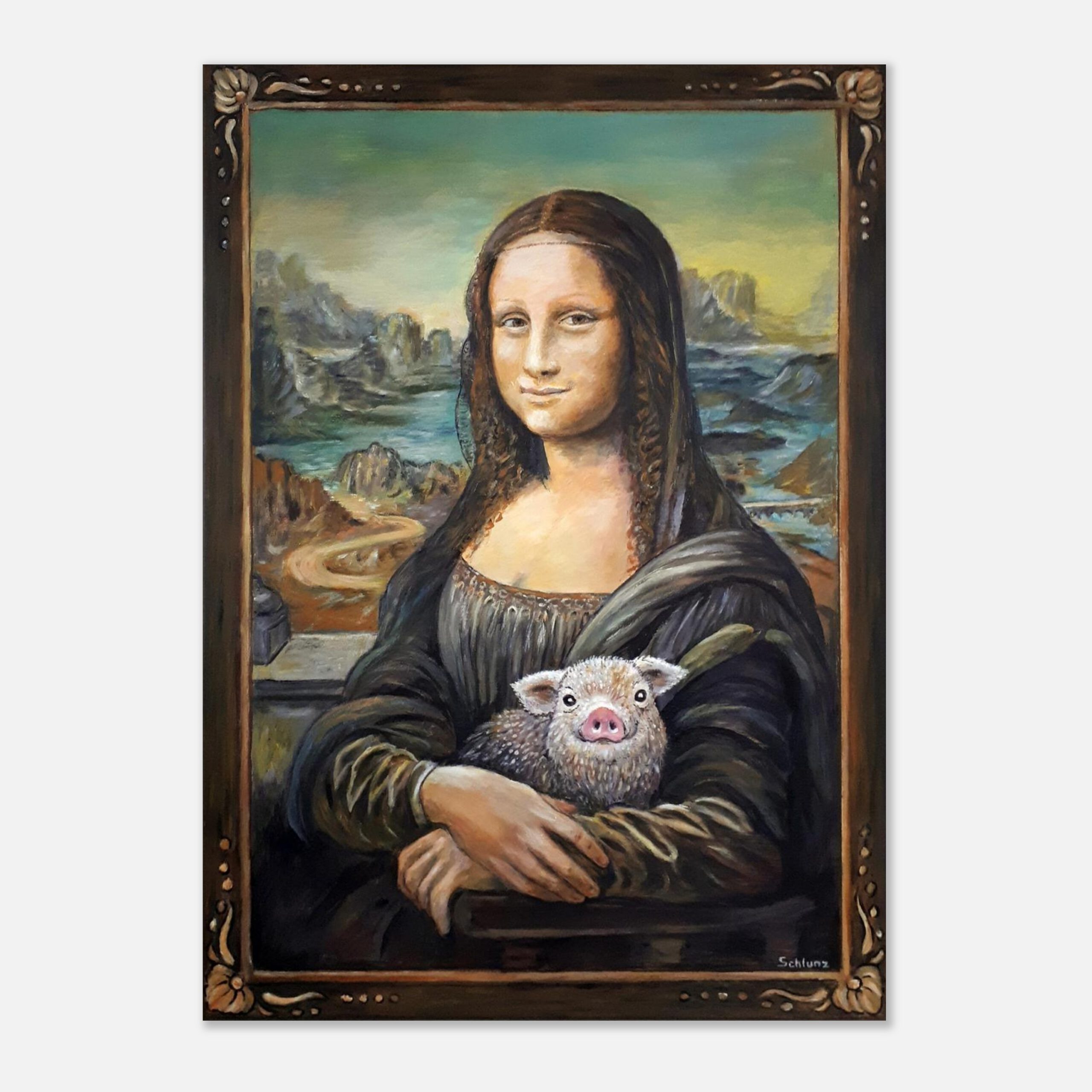 Der Druck hat die Maße 50×70 cm (Zoll: 20×28″) wie auch das Original, das ich mit Acryl auf Leinwand malte. Dabei war mir nicht bewusst, dass das Original von Leonardo dieselben Maße hat. Sie ist wirklich nicht groß…