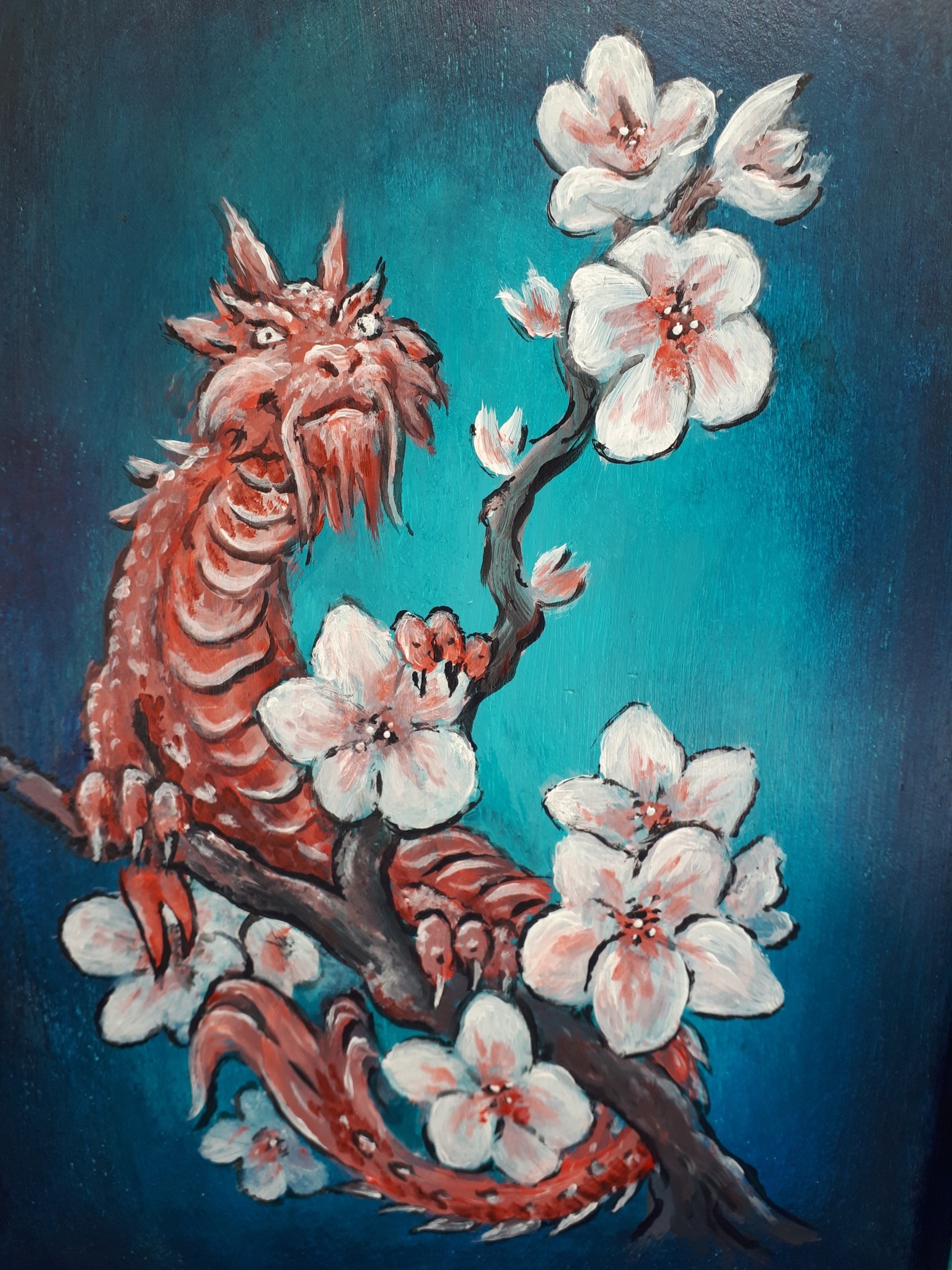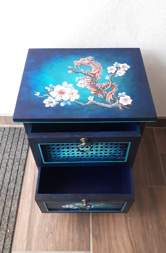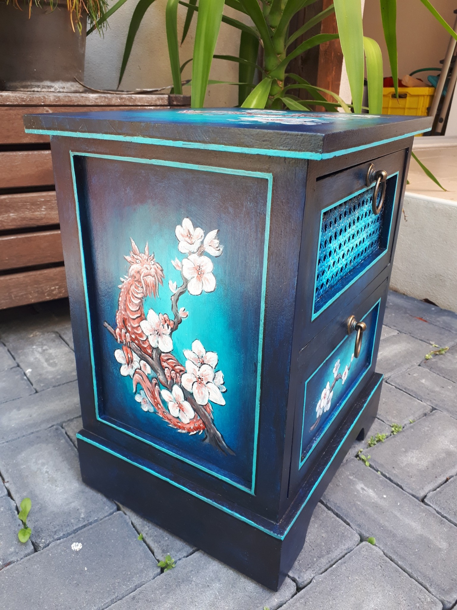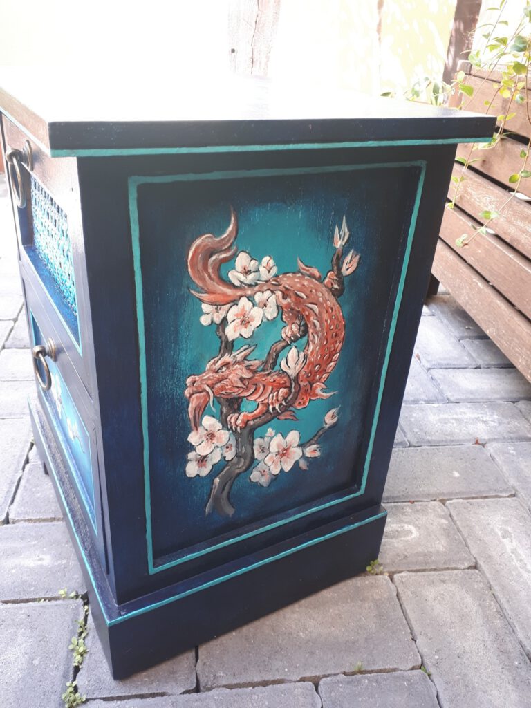Kirschdrachen-Schränkchen – Acryl auf Massivholz – verkauft